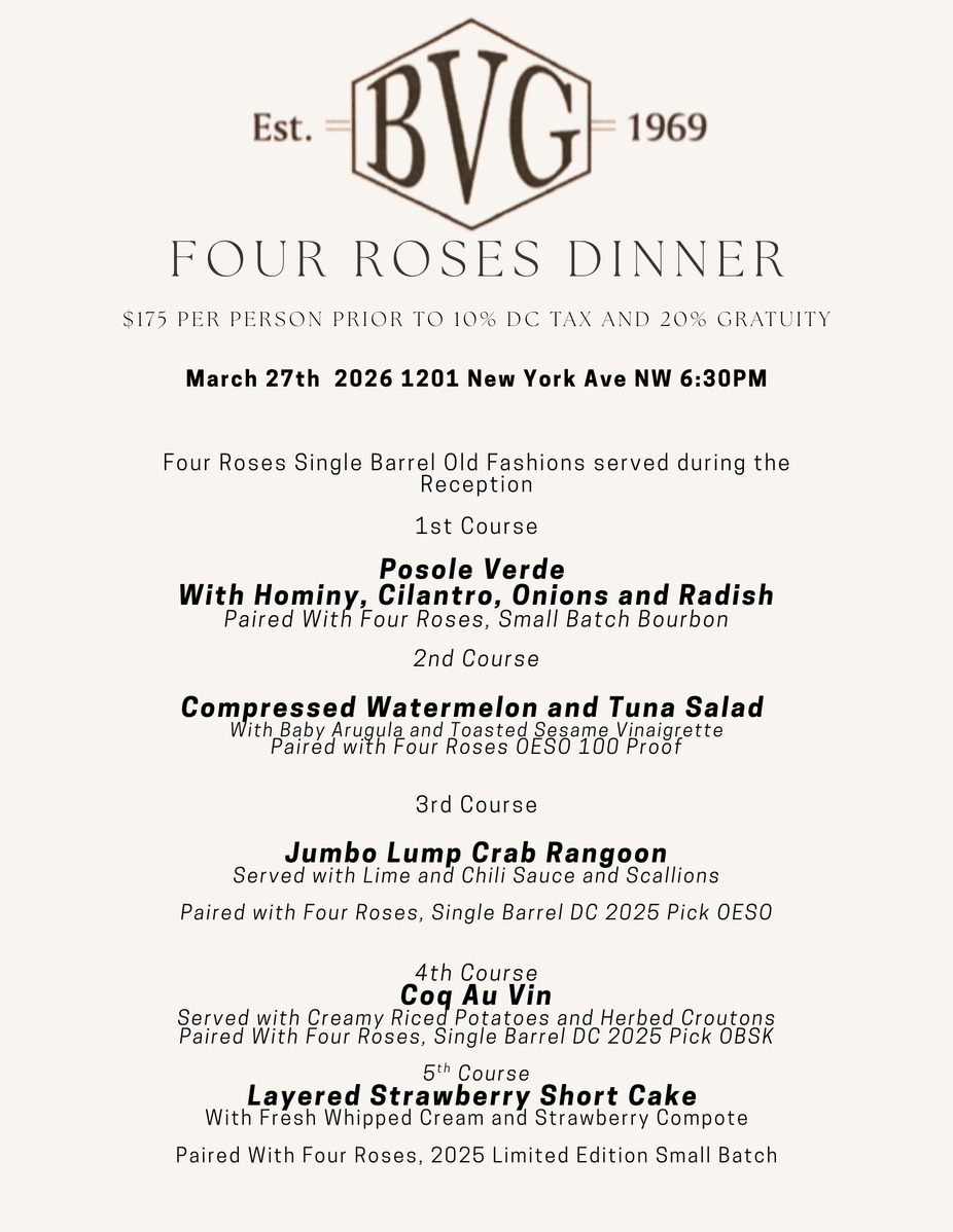 Bobby Van’s Grill in DC is hosting a 5 course dinner and Four Roses pairing on Friday March 27th at 6:30pm. Cost is 175/person (plus tax and tip). RSVP Jon@bobbyvanssteakdc.com with any questions and to reserve your seats.